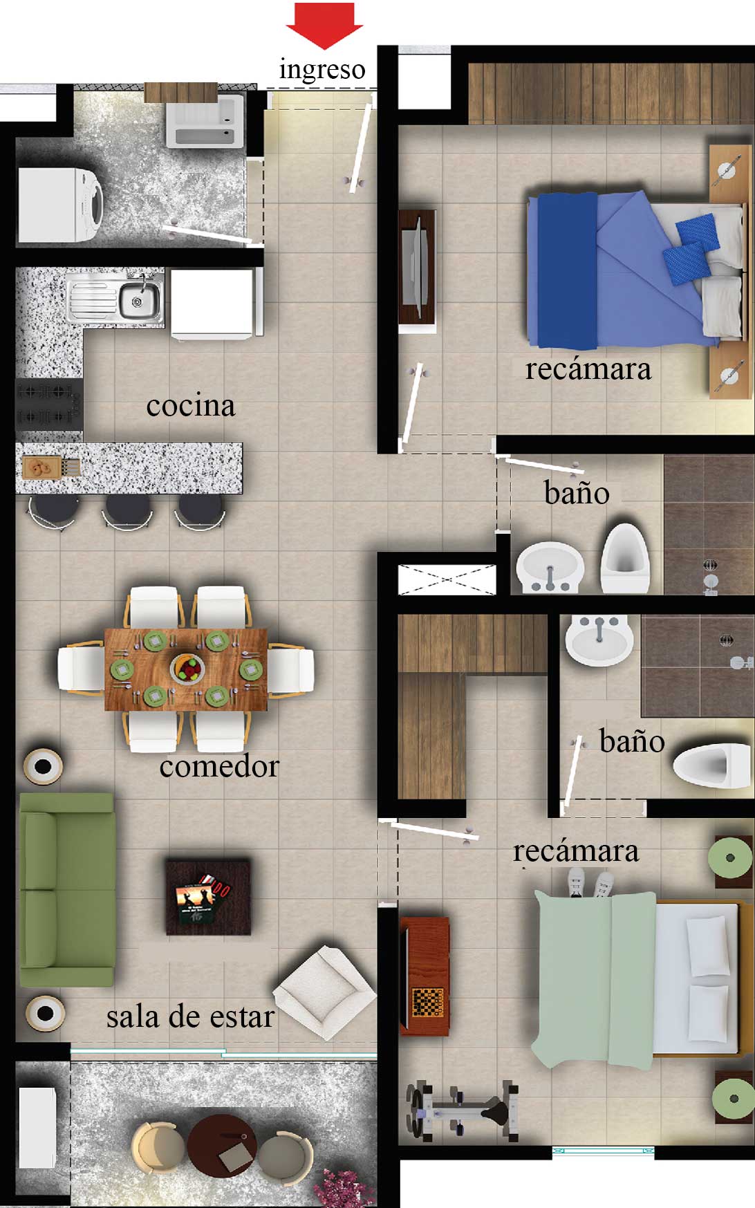 Vista Posterior 2 Recámaras 2 Baños 73.83 m2 Sala-Comedor Cocina Patio de servicio Terraza
