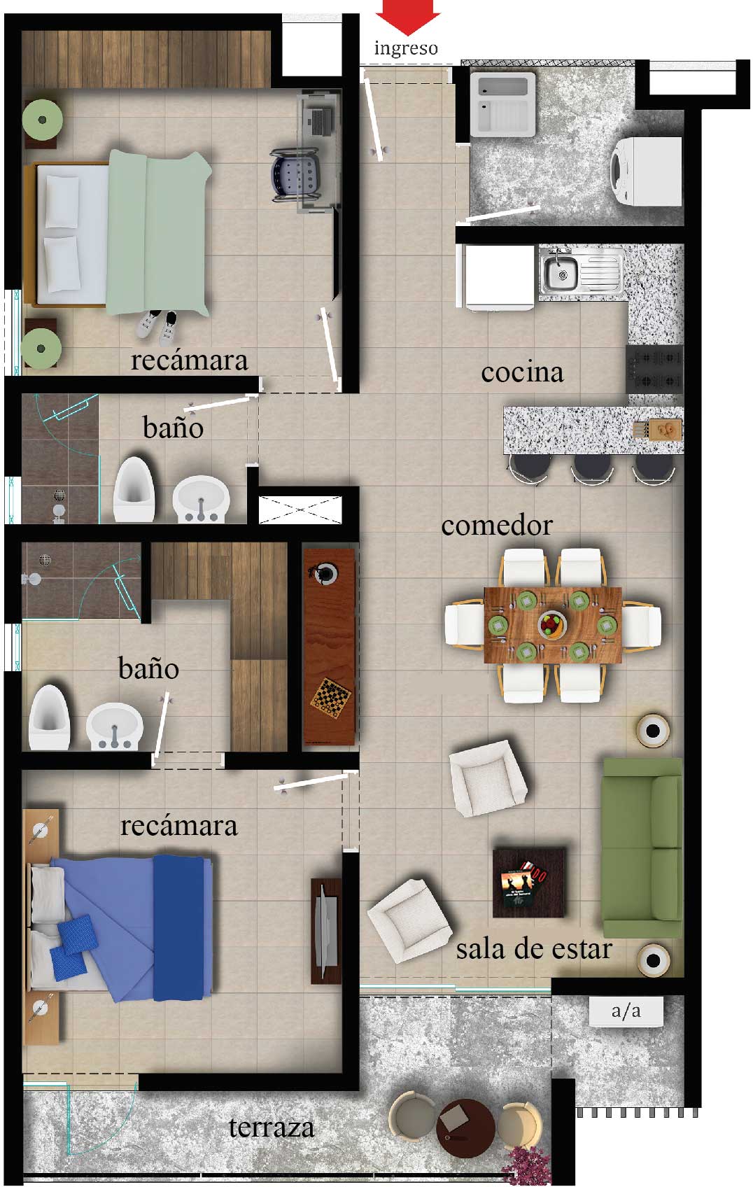 Vista Jardín 2 Recámaras 2 Baños 84.60 m2 Sala-Comedor Cocina Patio de servicio Balcón